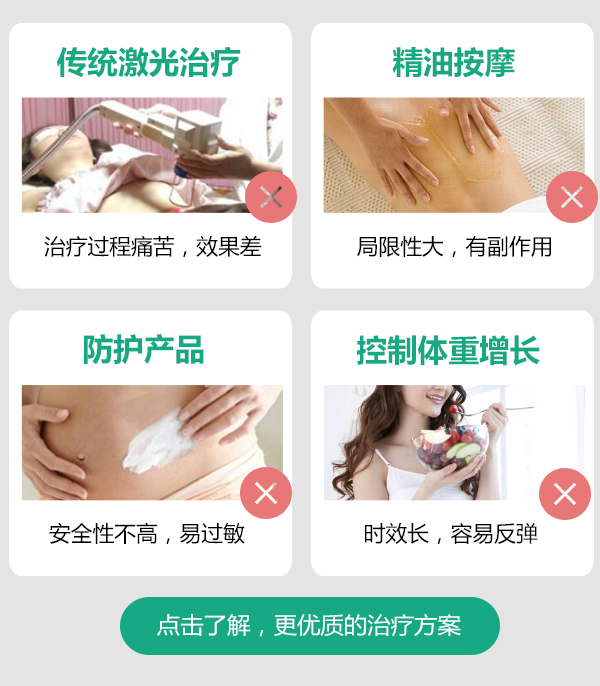 成都军建医院妊娠纹修复中心李主任指出:传统激光治疗、精油按摩、控制体重增长、使用防护产品等,是很多妊娠纹患者最常采用的治疗方法。这些方法不仅治疗时间长、见效慢、花费高,还达不到理想的修复效果,甚至可能危害身体!